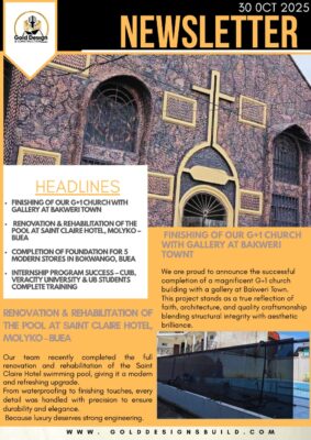 Welcome to the October 2025 edition of the Gold Design & Construction Newsletter — your monthly insight into our latest achievements, ongoing projects, and community initiatives. Each month, we showcase how our commitment to quality and innovation continues to shape modern construction in Cameroon and beyond.